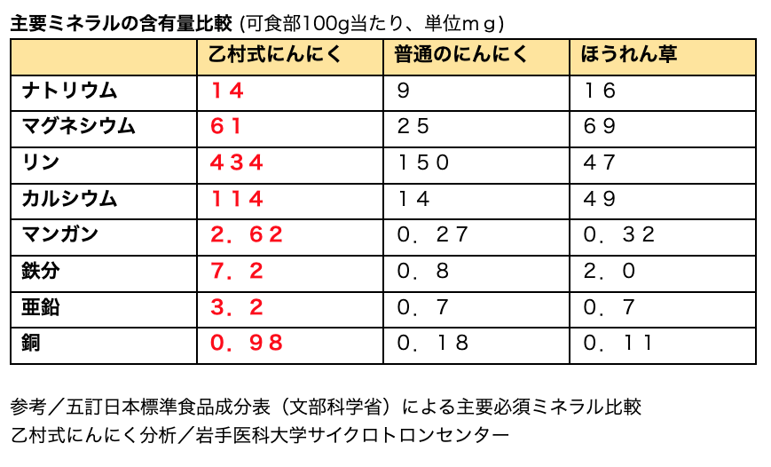 にんにく自体は、ガン予防効果の高い食品(※)とされますが、「乙村式にんにく」1粒には、普通のにんにく1玉の9倍の鉄分が含まれています。鉄分摂取に有効とされるほうれん草100gとくらべても、3.6倍の鉄分。ほかにも、カルシウムは8倍、亜鉛は4.5倍、マグネシウムは2倍以上と、驚きの栄養価。ミネラル豊富な健康野菜で病原菌に負けない身体づくりを!