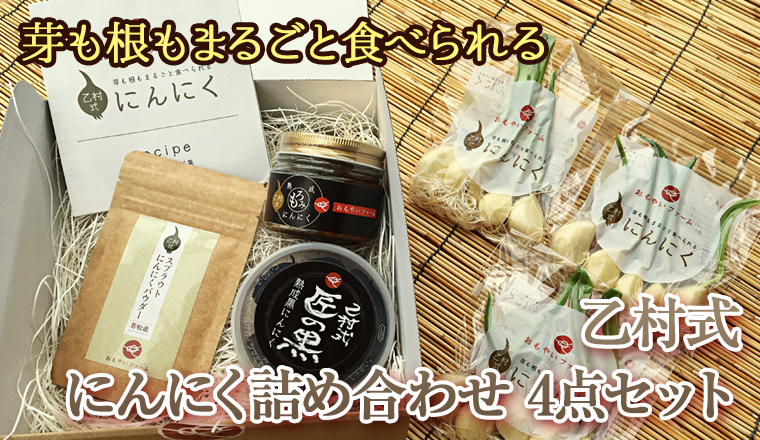| 商品内容 | 乙村式にんにく5本入×3袋 乙村式スプラウトにんにくパウダー30g 1袋 乙村式にんにく匠の黒100g 1個 乙村式熟成もろみにんにく100g 1瓶 |
