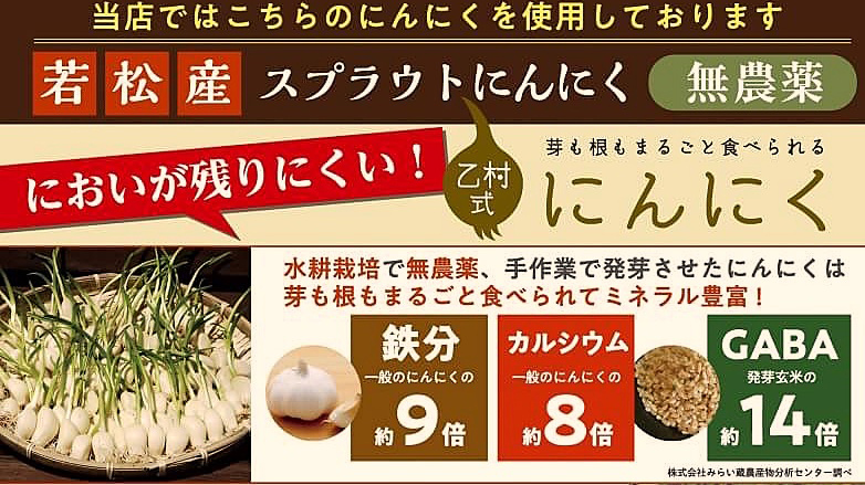 高度な浄水技術で知られる北九州の水を利用した手作業による水耕栽培、安心安全の無農薬で発芽させた「乙村式にんにく」。商品を開発した、おもやいファーム代表の乙村隆文さんは、目新しくて喜ばれる食材開発を目指し、スプラウトにんにく(発芽にんにく)のハウス栽培技術をベースにおよそ2年の試行錯誤を重ねて「乙村式にんにく」を完成させました。