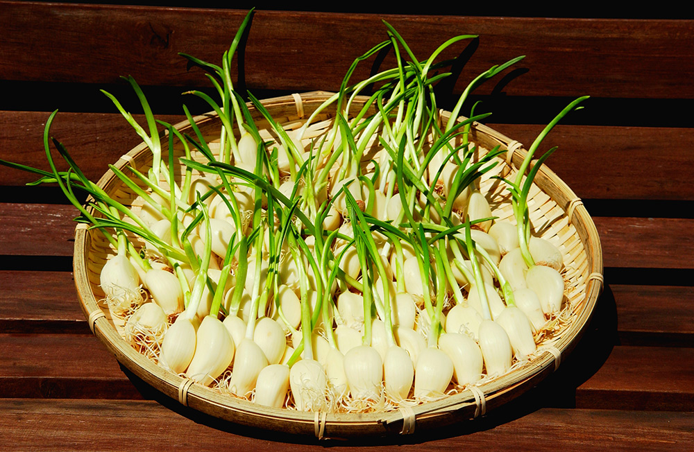 芽も根もまるごと食べられる「乙村式にんにく」。発芽直後の野菜には、これから成長するためのエネルギーが含まれているため、成熟した野菜より多くの栄養素が凝縮されています。